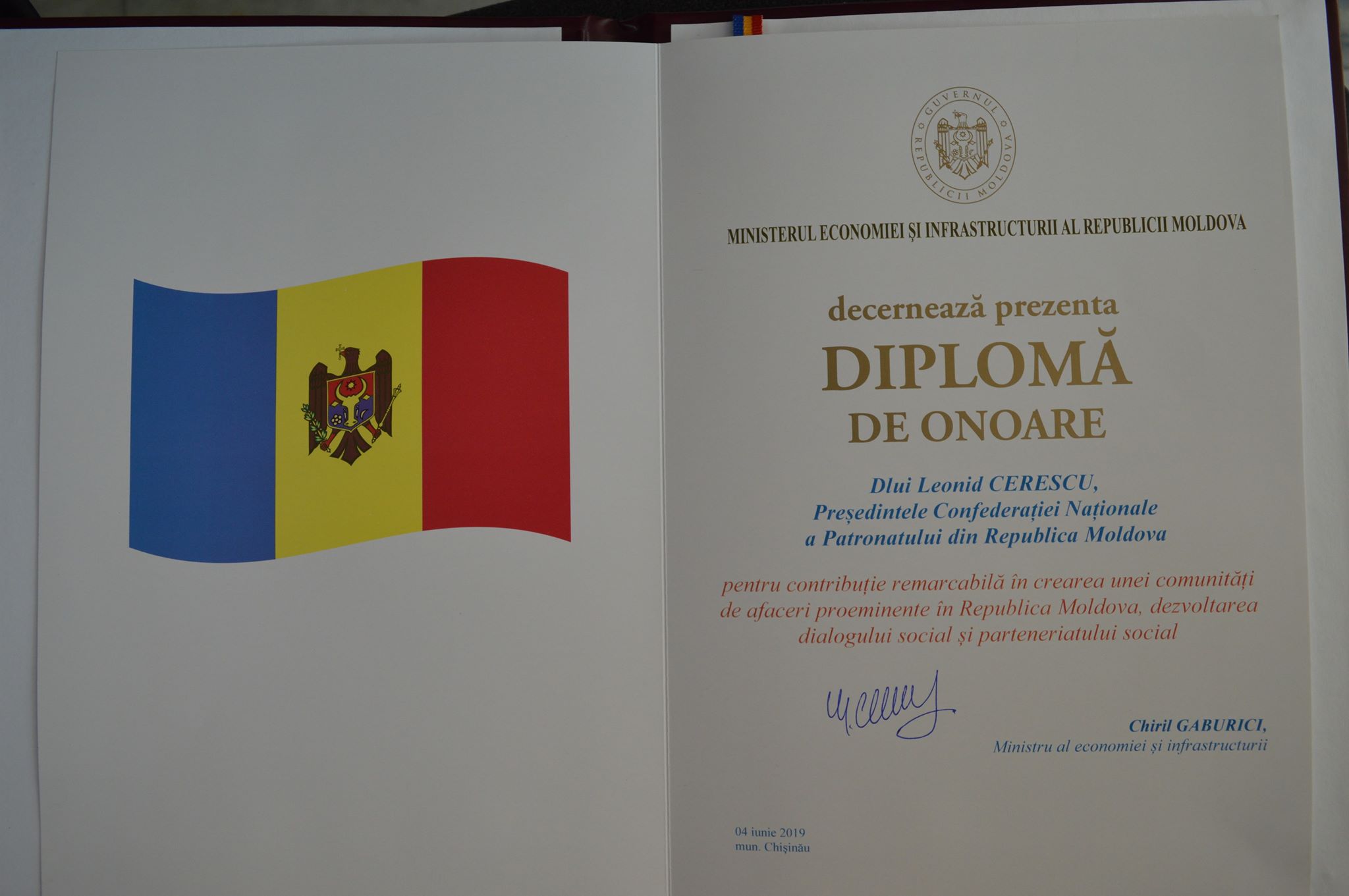 Suntem onorați de decernarea Diplomei oferită de Dl Chiril Gaburici, Ministru al Economiei și Infrastructurii, Domnului Leonid Cerescu, președinte al Confederației Naționale a Patronatului din Republica Moldova, pentru contribuție remarcabilă în crearea comunității de afaceri proeminente în țara noastră, dezvoltarea dialogului și parteneriatului social.
